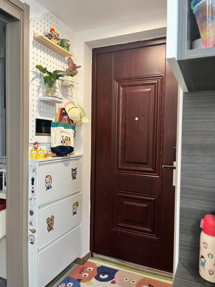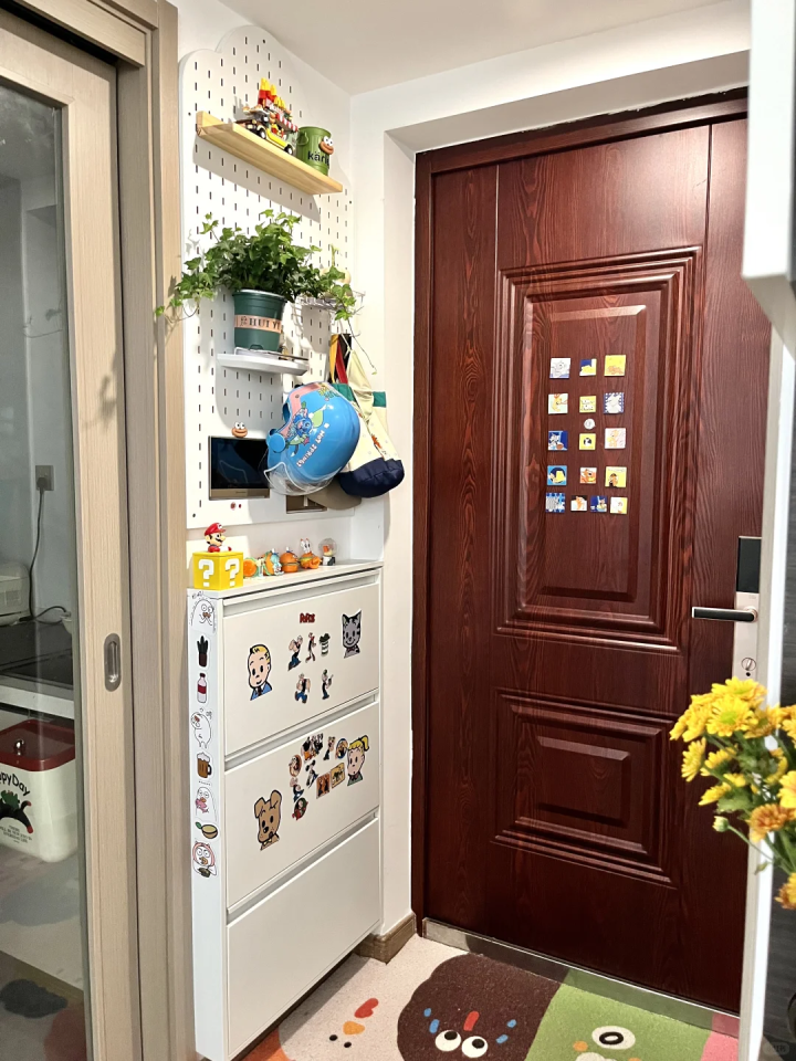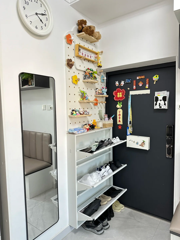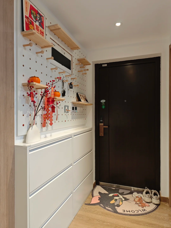 鞋柜的上方大家还可以安装洞洞板来放置一些钥匙以及常用的小物件,满足日常使用需求的同时,也不会让玄关变得凌乱。